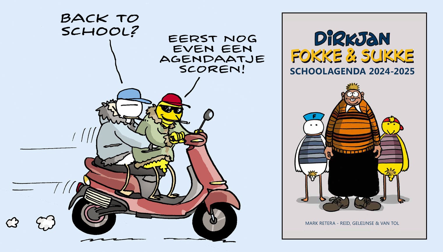 Mark Retera en wij hebben een gezamenlijke schoolagenda gemaakt, niet tegenstaande het feit dat geen enkele scholier meer weet wat dat is. De agenda is prima te gebruiken als gezinsagenda op de keukentafel of gewoon als een leuk boek boordevol grappige strips van Dirkjan en Fokke & Sukke. In ieder geval, het is niet het eclatante succes dat wij hadden verwacht, na het mobieltjesverbod, dus we hebben hem nu al afgeprijsd. Je kunt hem hier met 50% korting (en geen verzendkosten) bestellen: